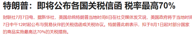 特朗普对等关税暂缓期马上到期,美国总统特朗普当地时间6日在社交媒体发文说,美国政府将于当地时间7日中午12时起公布与贸易伙伴的关税信函或关税协议。特朗普此前表示,拟于8月1日起对部分国家的商品实施最高达70%的关税措施。