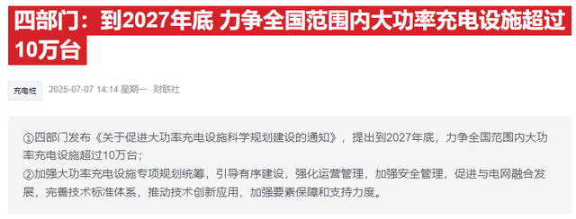 四部门发布《关于促进大功率充电设施科学规划建设的通知》,提出到2027年底,力争全国范围内大功率充电设施超过10万台;加强大功率充电设施专项规划统筹,引导有序建设,强化运营管理,加强安全管理,促进与电网融合发展,完善技术标准体系,推动技术创新应用,加强要素保障和支持力度。
